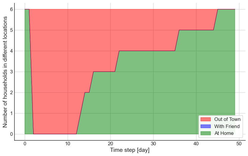 The figure below shows the number of households at each location (at home, with a friend, or out of town) over the 50-week simulation. After the earthquake, most households leave their damaged homes. As buildings are repaired and potable water is restored, households gradually return.