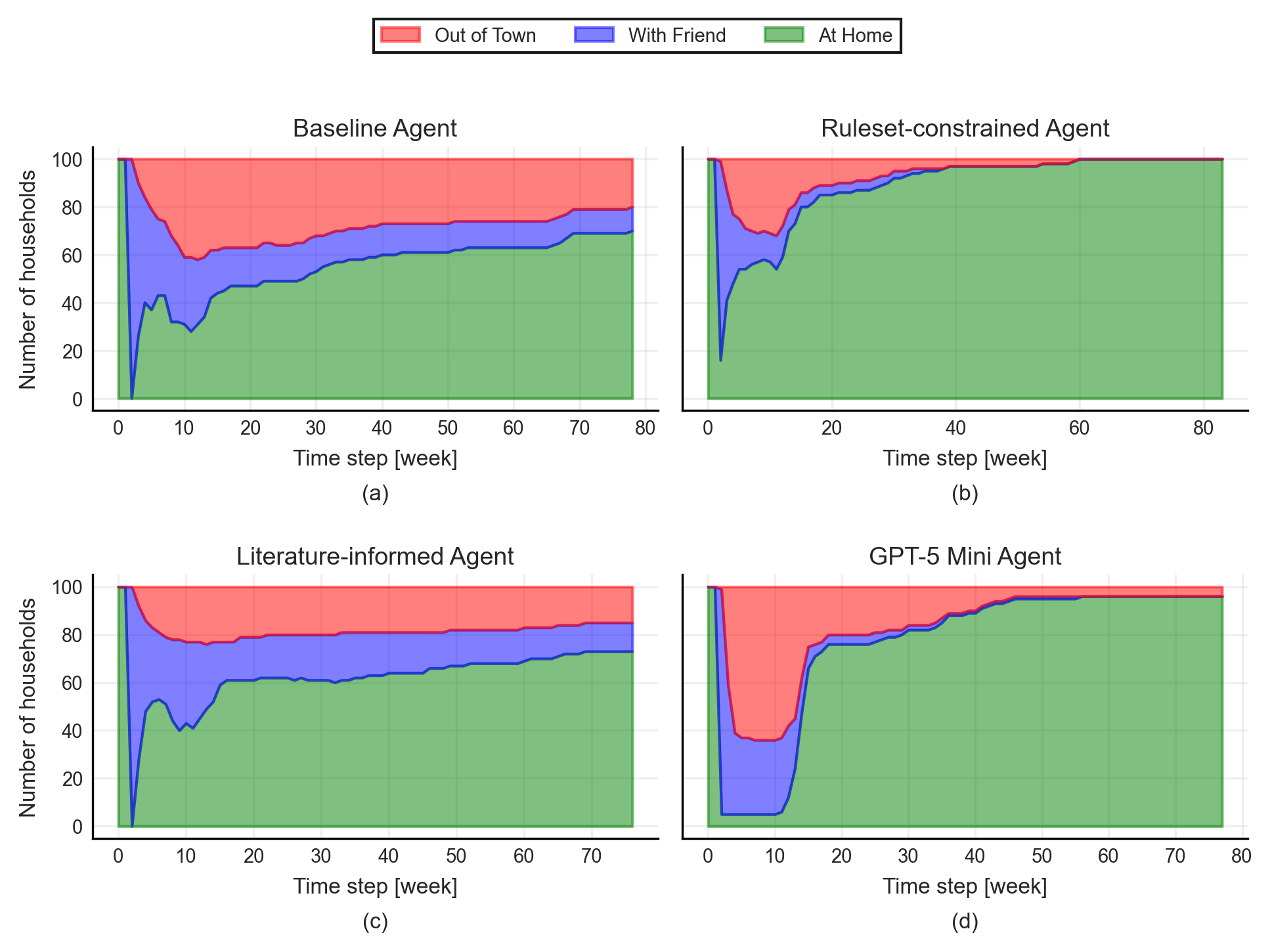 The figure below compares household location dynamics across all four agent prompting strategies. Each panel shows the stacked area plot of households at home, with a friend, or out of town over the recovery period. The baseline and GPT-5 Mini agents show similar recovery trajectories, while the literature-informed and ruleset-constrained agents produce distinct displacement and return patterns shaped by their additional guidance.