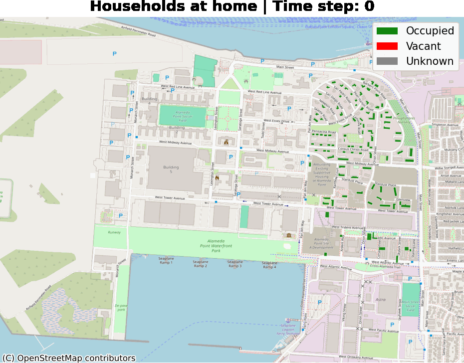 The animation below shows the spatial distribution of household occupancy over the recovery period. Each building is colored according to occupancy: green indicates occupied buildings and red indicates vacant buildings. As buildings are repaired and water service is restored, households return and buildings transition from red to green.